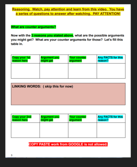 I’m pretty excited for page 3 because of this old rose box. The LINKING WORDS box has a special instruction. It says “skip this for now”. Looking forward that the students can follow exactly these guided steps. If you notice the sky blue highlights, that dictates a new set of instructions and these items should be clearly explained when you present the document. The sky blue highlights are optional, but then I will still have to encourage my students to try hard and dive deeper by exploring this section. In these boxes, they need to add some facts about their opinion. That involves searching the web, and could work better for advanced students. Though of course everyone can give it a try. It depends on how much time you have, or just a simple teacher’s discretion.